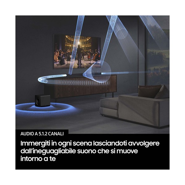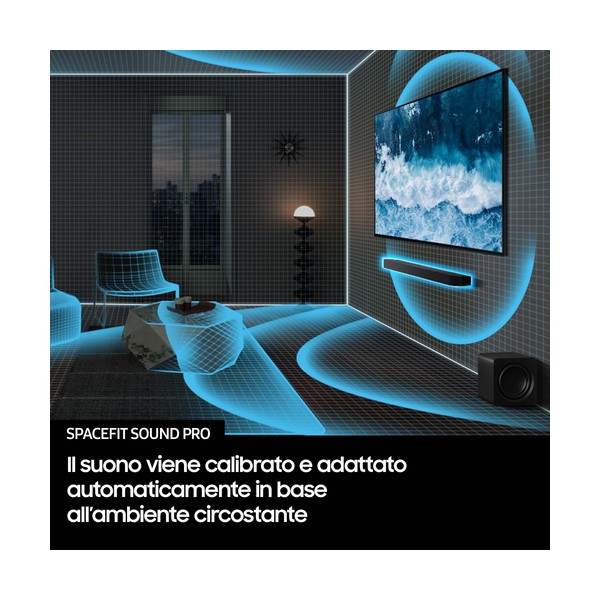 Un suono straordinario in perfetta sintonia con il tuo ambiente. La soundbar analizza lambiente e regola l'audio in base alle sue caratteristiche, ottimizzando anche i bassi, per ottenere un suono nitido e avvolgente.