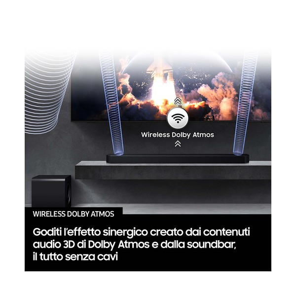 Un audio surround 3D di altissima qualità. Con la tecnologia Dolby Atmos integrata in modalità wireless nella soundbar, potrai distinguere nitidamente ogni suono da qualunque direzione e vivere ogni film da protagonista.