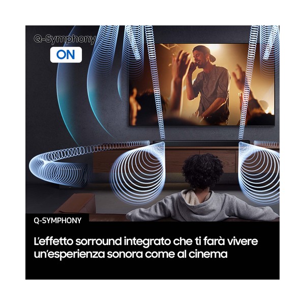 Con Q-Symphony, l'AI separa la voce dai suoni di sottofondo per riprodurli utilizzando il canale più indicato. In questo modo, i dialoghi saranno più nitidi e l'audio surround 3D sarà ancora più avvolgente, con gli altoparlanti del televisore e la soundbar che lavorano in armonia.