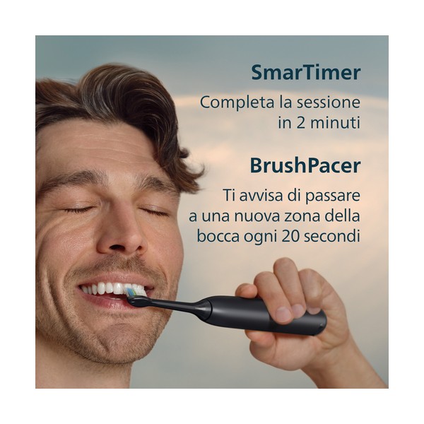 Due minuti è ciò di cui hai bisogno per una pulizia completa, con il nostro SmarTimer potrai sapere quando il tempo è finito. Per una pulizia uniforme in tutta la bocca, BrushPacer divide la sessione in segmenti, con una leggera pausa di vibrazione che indica il momento di andare avanti. In questo modo potrai ottenere una pulizia uniforme a ogni spazzolamento.