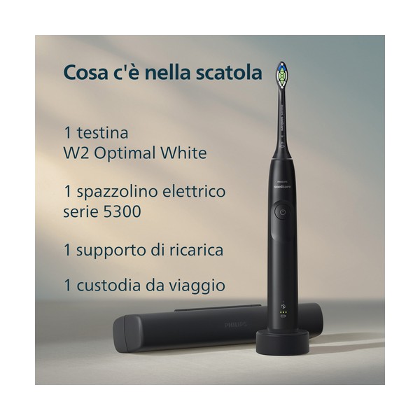 Lo spazzolino Philips Sonicare 5300 va oltre la pulizia profonda per rimuovere senza sforzo le macchie superficiali per un sorriso radioso e più bianco. Con la testina W2 Optimal White, è facile mantenere la brillantezza dei denti tra un trattamento sbiancante professionale e l'altro, rimuovendo fino a 7 volte più placca rispetto a uno spazzolino manuale.