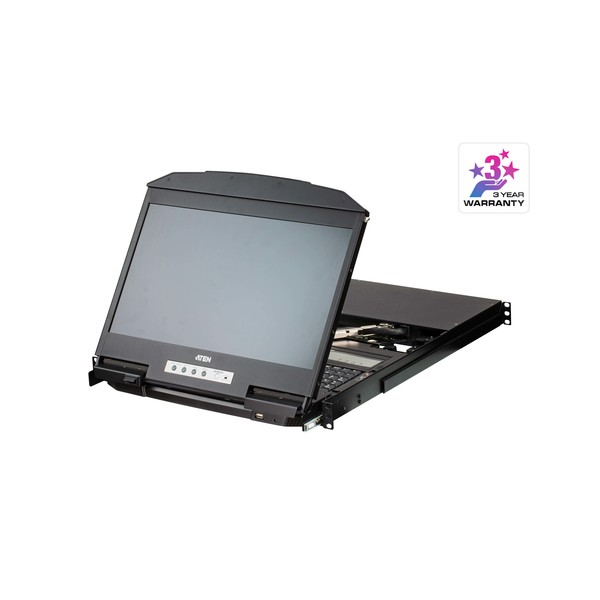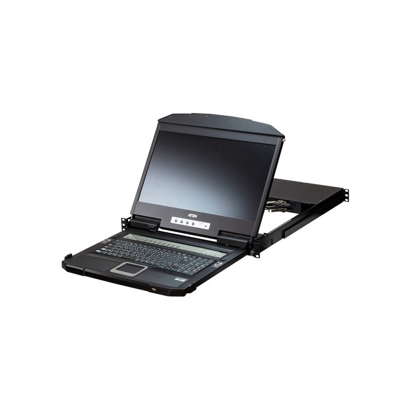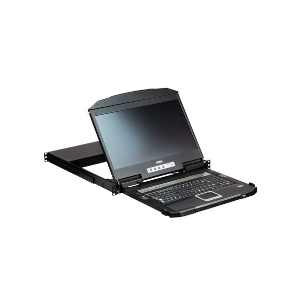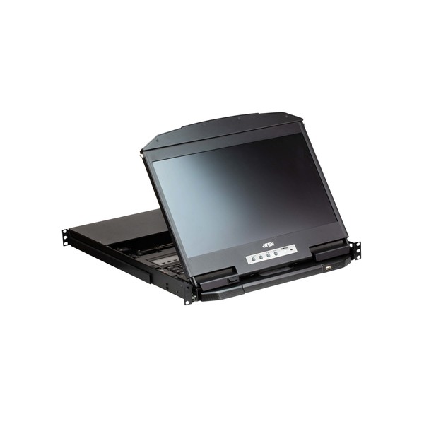 Console KVM integrata con monitor LCD widescreen da 18,5" con retroilluminazione LED in un alloggiamento a due binari con spazio in alto e in basso per operazioni fluide in un sistema rack alto 1 U