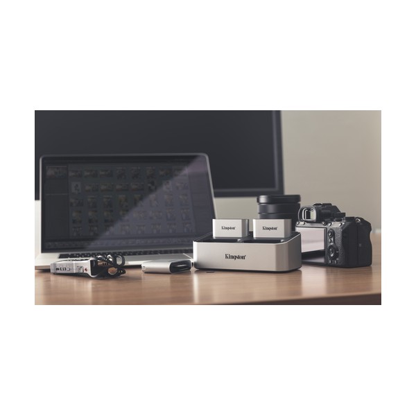 La Workflow Station e i lettori di Kingston offrono un sistema flessibile per trasferire video, foto e audio da più fonti contemporaneamente.* Velocizzate il flusso di lavoro di post produzione e create una configurazione di offload dei file ideale per le vostre esigenze. Il Workflow Station Dock è interamente personalizzabile. In tal modo è possibile utilizzare solo il miniHub USB , i lettori SD o i lettori microSD richiesti per i vostri scatti. Indipendentemente dal fatto che si tratti di scatti multi-cam a 4K/8K effettuati con registratori audio portatili per ciascun host, o di filmati B-Roll con droni e GoPro, è possibile collegare simultaneamente al dock fino a quattro lettori per il trasferimento rapido di filmati. La Workflow Station e i relativi lettori supportano le velocità dello standard USB 3.2, che consente di eseguire i processi di post produzione con la massima rapidità. Per una maggiore flessibilità, i lettori di schede possono anche essere utilizzati in movimento. Quando è necessario effettuare scatti o riprese in esterno, è sufficiente mettere l’hub o i lettori necessari in una borsa e collegarli al laptop mediante il cavo USB incluso.