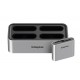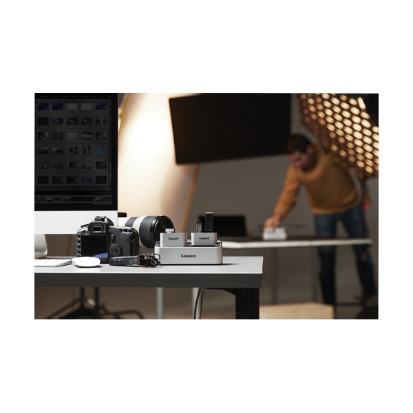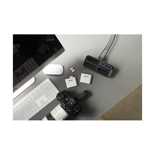 La Workflow Station e i lettori di Kingston offrono un sistema flessibile per trasferire video, foto e audio da più fonti contemporaneamente.* Velocizzate il flusso di lavoro di post produzione e create una configurazione di offload dei file ideale per le vostre esigenze. Il Workflow Station Dock è interamente personalizzabile. In tal modo è possibile utilizzare solo il miniHub USB , i lettori SD o i lettori microSD richiesti per i vostri scatti. Indipendentemente dal fatto che si tratti di scatti multi-cam a 4K/8K effettuati con registratori audio portatili per ciascun host, o di filmati B-Roll con droni e GoPro, è possibile collegare simultaneamente al dock fino a quattro lettori per il trasferimento rapido di filmati. La Workflow Station e i relativi lettori supportano le velocità dello standard USB 3.2, che consente di eseguire i processi di post produzione con la massima rapidità. Per una maggiore flessibilità, i lettori di schede possono anche essere utilizzati in movimento. Quando è necessario effettuare scatti o riprese in esterno, è sufficiente mettere l’hub o i lettori necessari in una borsa e collegarli al laptop mediante il cavo USB incluso.