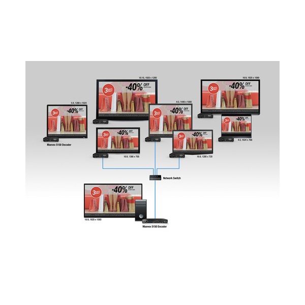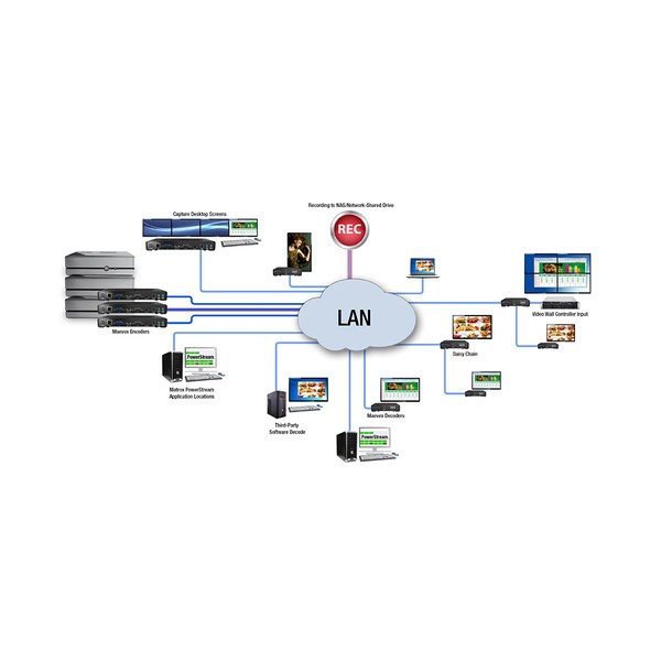 La soluzione di distribuzione AV-over-IP Matrox Maevex include i codificatori e i decodificatori Maevex 5100 Series. Questi dispositivi sono in grado di estendere e registrare audio e video 1080p60 su una rete IP standard a velocità di bit ridotte definite dagli utenti e garantiscono una qualità eccellente e un consumo minimo della larghezza di banda della rete. Il codificatore Maevex registra e distribuisce flussi audio e video di alta qualità e utilizza lo standard di compressione video H.264. È in grado di trasmettere flussi ai decodificatori Maevex o a dispositivi e PC che supportano i protocolli di rete richiesti. È anche in grado di registrare su unità NAS o unità di rete condivise. Il robusto software Matrox PowerStream™ è incluso con l'hardware e consente di individuare, gestire e regolare in remoto la rete di dispositivi Maevex. Tramite questo software gli amministratori possono definire più parametri per i flussi e bilanciare la qualità e il consumo della larghezza di banda. È anche disponibile l'API Maevex che consente ai programmatori di integrare le funzionalità correnti nelle applicazioni esistenti, oppure di creare nuovo software simile a PowerStream per soddisfare esigenze specifiche.