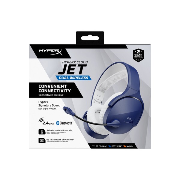 Design elegante. Esperienza ottimizzata. Le cuffie wireless HyperX Cloud Jet Dual offrono un'esperienza eccezionale con la connettività a 2,4 GHz e Bluetooth 5.3. Sono ideali per i nuovi appassionati del gaming o per chi desidera passare da un dispositivo entry-level a un modello superiore. Muoviti facilmente tra PC, console e dispositivo mobile, con un’esperienza audio straordinaria offerta dai driver da 40 mm. Comunica in modo cristallino con il tuo team grazie al microfono ad archetto swivel-to-mute. Con una autonomia fino a 25 ore[1], puoi immergerti in sessioni di gioco prolungate senza interruzioni. I controlli integrati semplificano la regolazione del volume, l'esclusione del microfono e il passaggio da una connessione all'altra. Inoltre, il design leggero, i padiglioni in mesh traspirante e l'archetto elastico di sospensione offrono il massimo comfort per le lunghe maratone di gioco. Alza il livello della tua gaming experience con HyperX Cloud Jet!