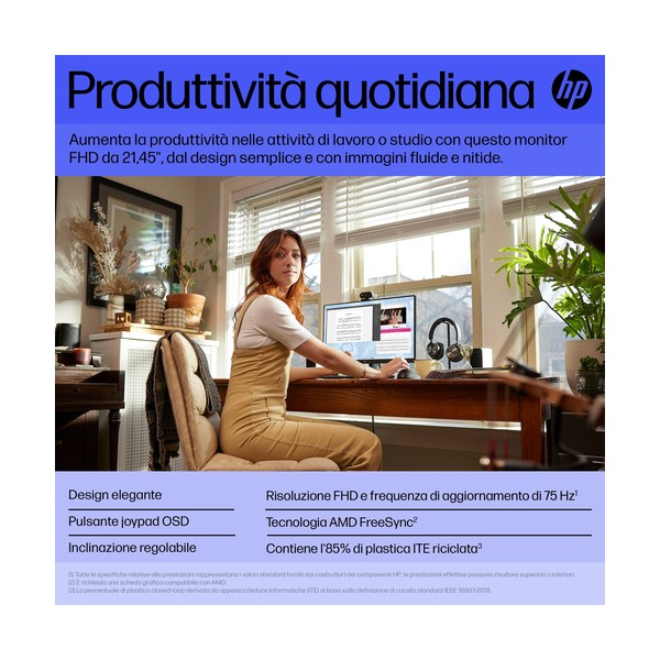 Produttività quotidiana Espandi la tua visione e migliora la produttività, con questo monitor FHD da 21,45'' (54,5 cm) di diagonale, perfetto per sia per il lavoro che per lo studio. Ampio ed elegante, questo monitor semplifica e completa l'ambiente di lavoro con uno schermo che offre immagini nitide e uniformi in un design essenziale, per fare di più giorno dopo giorno.