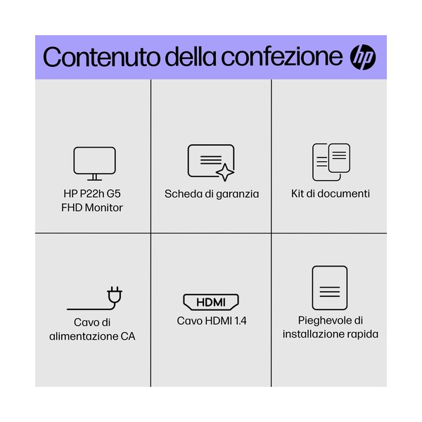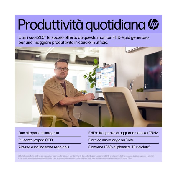 Per aiutare il pianeta, questo monitor dotato di registrazione EPEAT®[5] contiene l'85% di plastica riciclata proveniente unicamente da dispositivi IT (ITE)[6] e viene fornito in un imballaggio riciclabile al 100%[7].