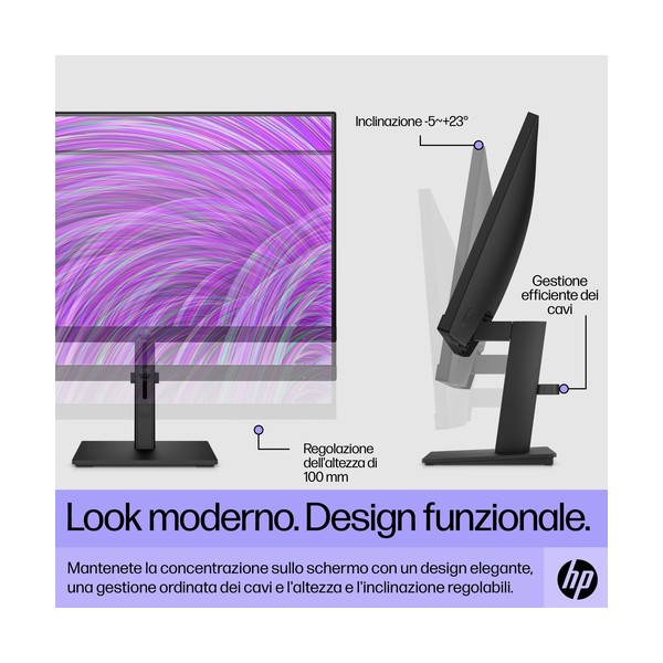 Più spazio di visualizzazione sullo schermo e area di lavoro più ordinata ed efficiente grazie all'elegante cornice senza bordi su 3 lati, alla gestione ordinata dei cavi e alla base del supporto più piccola del a 27%[2] con inclinazione e altezza regolabili per un'esperienza di visione perfetta.
