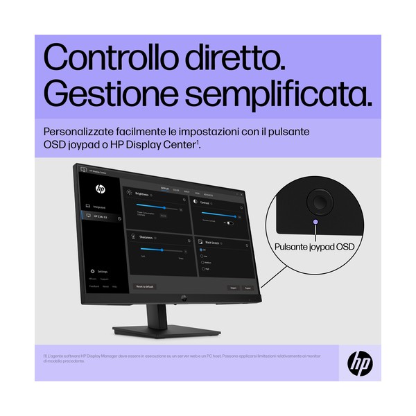 Personalizzate le impostazioni del monitor grazie all'intuitivo pulsante Joypad oppure gestite le impostazioni direttamente sullo schermo con HP Display Center[3] e HP Display Manager[4], per uno spazio di lavoro semplice e ordinato.