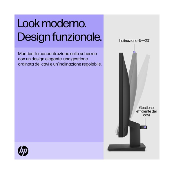 Con una sottile cornice micro-edge su 3 lati, un efficiente sistema di gestione dei cavi e un sostegno slanciato che permette di regolare l'inclinazione per ottimizzare la visione, permette di liberare la scrivania e concentrarsi completamente sullo schermo.