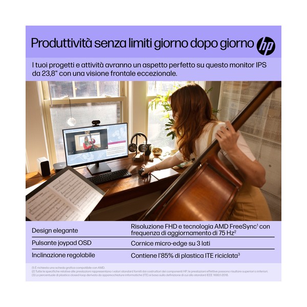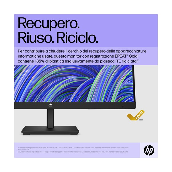 Per aiutare il pianeta, questo monitor dotato di registrazione EPEAT®[3] contiene l'85% di plastica riciclata proveniente unicamente da dispositivi IT (ITE)[4] e viene fornito in un imballaggio riciclabile al 100%[5].