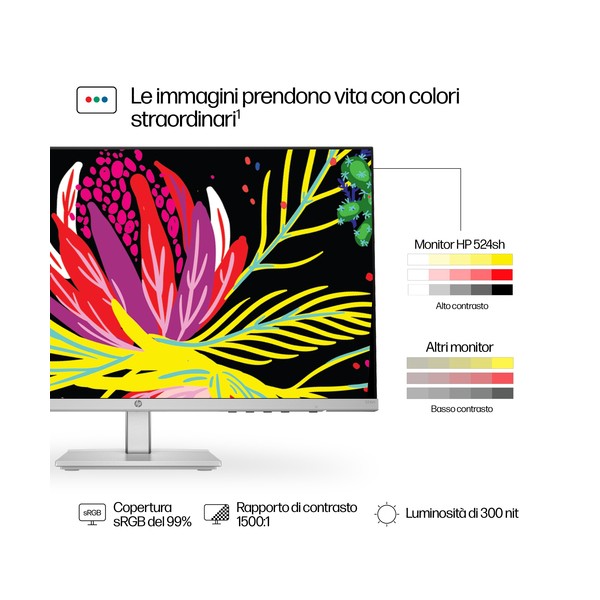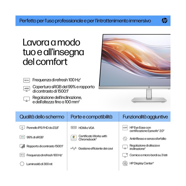 Scegliete liberamente la vostra modalità di lavoro Se cerchi la tecnologia giusta per affrontare una giornata piena di progetti, riunioni e altro ancora, il monitor HP Serie 5 FHD da 23,8” ad altezza regolabile è la soluzione che fa per te. Design elegante che si integra perfettamente in qualsiasi ambiente di lavoro. Porta la tua produttività a un livello superiore con uno schermo eccezionale, con supporto regolabile e un comfort unico. Aggiungi flessibilità al tuo modo di lavorare e migliora qualità delle immagini, rapporto di contrasto e frequenza di refresh.[1]