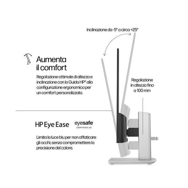 Migliora la tua concentrazione tramite un supporto ergonomico con regolazione di altezza e inclinazione, abbinato alla Guida all'installazione ergonomica[2] per un comfort personalizzato. In più HP Eye Ease con certificazione Eyesafe®[3] riduce la luce blu.