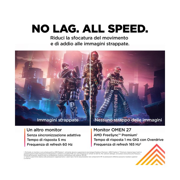 Vivi a fondo l'azione grazie a tempi di risposta GTG di 1 ms con overdrive e una frequenza di refresh di 165 Hz, a cui si aggiunge la tecnologia AMD FreeSync™ Premium[2].