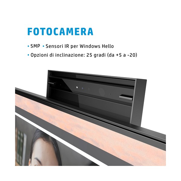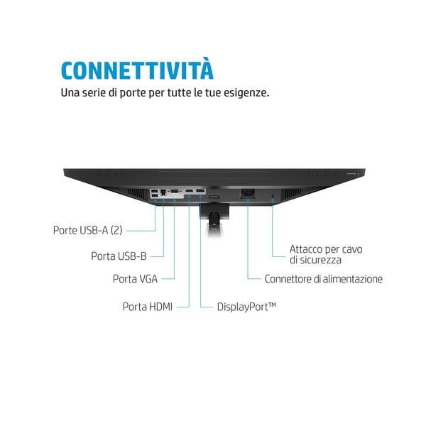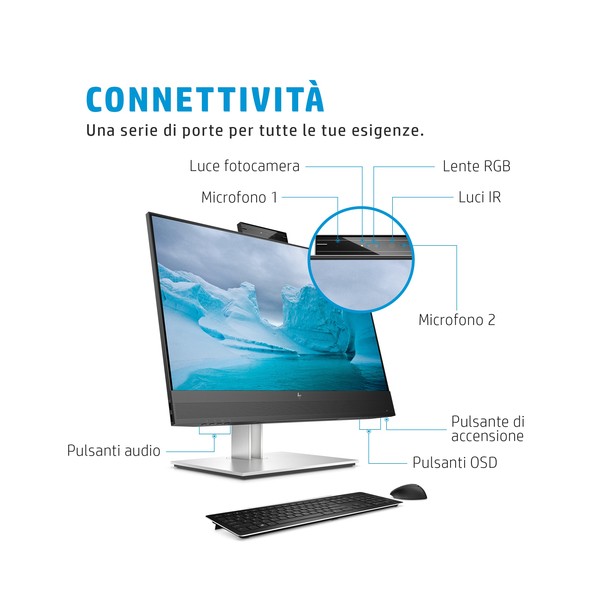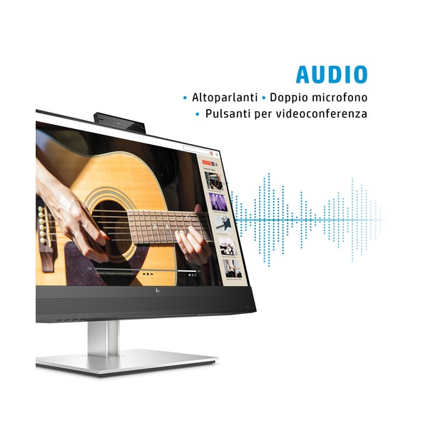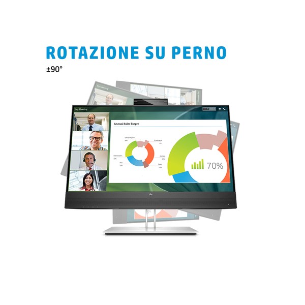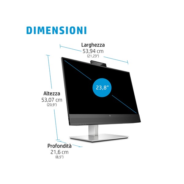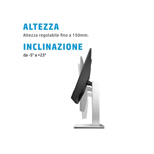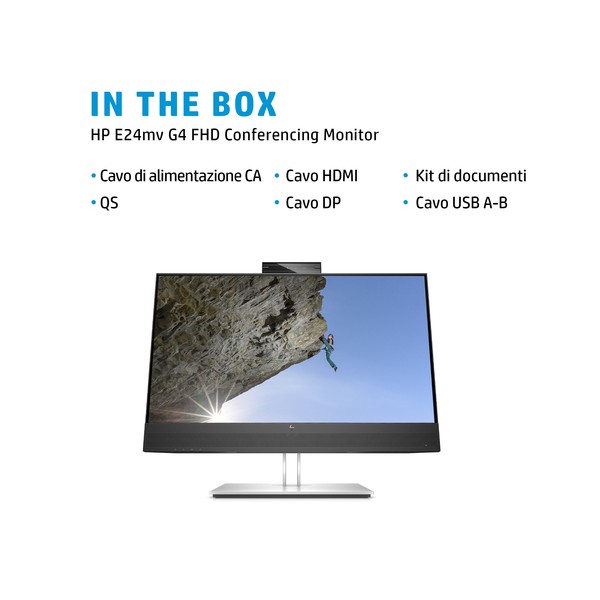 HP E24mv G4. Dimensioni schermo: 60,5 cm (23.8"), Risoluzione del display: 1920 x 1080 Pixel, Tipologia HD: Full HD, Tempo di risposta: 5 ms, Rapporto d'aspetto nativo: 16:9, Angolo di visualizzazione (orizzontale): 178°, Angolo di visualizzazione (verticale): 178°. Altoparlanti incorporati. Hub USB integrato. Montaggio standard VESA, Regolazione altezza. Colore del prodotto: Nero, Argento