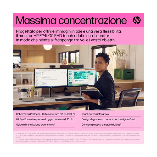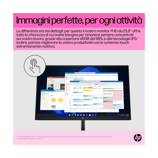 Quando i dettagli fanno la differenza, questo monitor FHD con diagonale da 23,8" offre la nitidezza di cui avete bisogno per rimanere concentrati sul vostro lavoro, tramite una profondità del colore sRGB del 99% e tecnologia IPS[1]. In più il display touchscreen, veloce e reattivo, semplifica la produttività.