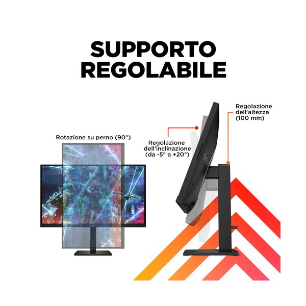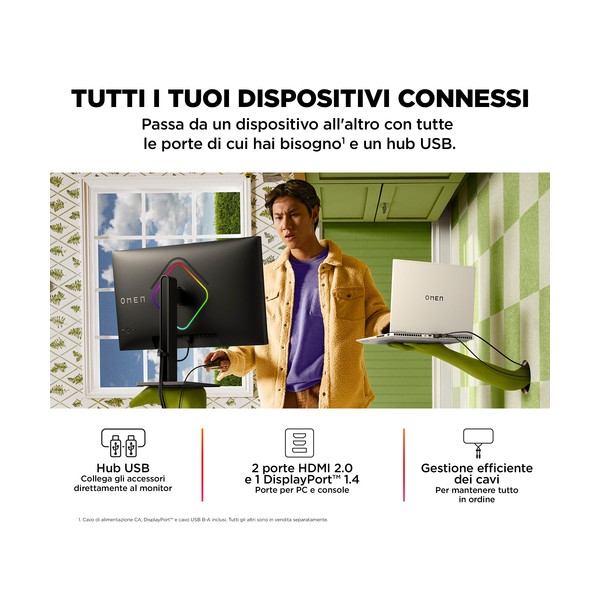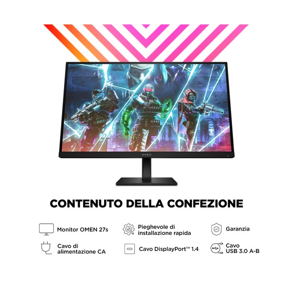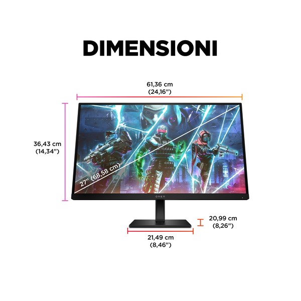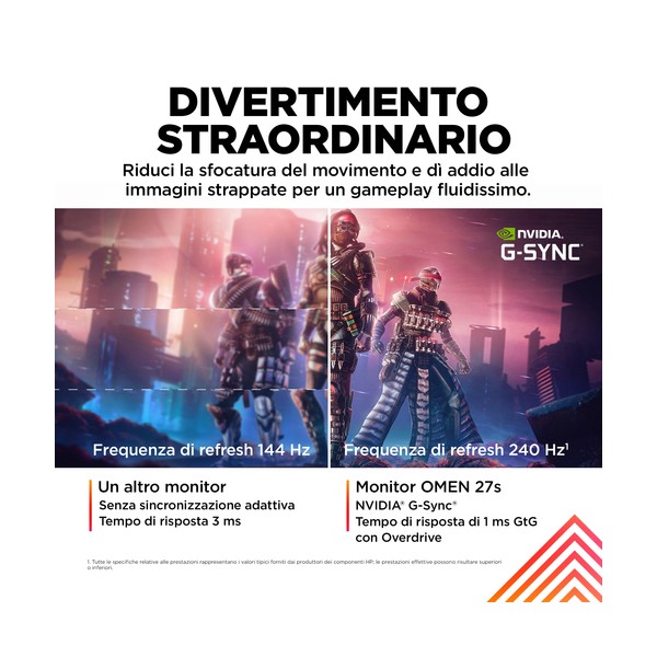 A TUTTA VELOCITÀ NEL DIVERTIMENTO Con il monitor da gaming OMEN by HP da 27'', con display FHD a 240 Hz, i tuoi avversari non hanno alcuna possibilità. Questo monitor compatibile con la tecnologia NVIDIA® G-SYNC® offre una visione incredibilmente fluida e dettagli nitidissimi[1], per consentirti di dare il massimo. Con un design incredibilmente raffinato, offre una combinazione unica di velocità e stile per un'esperienza eccezionale dentro e fuori dal gioco.