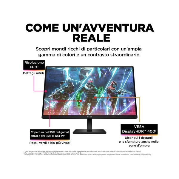 Con le nitidissime immagini garantite dalla risoluzione FHD[2], puoi immergerti completamente in un mondo curato nei minimi dettagli. Goditi fino in fondo la vasta gamma di colori e tonalità offerti dallo spazio colore sRGB al 99% e DCI-P3 al 95%[1]. Grazie alla specifica VESA DisplayHDR™ 400[3], potrai distinguere tutti i dettagli anche nelle zone d'ombra.