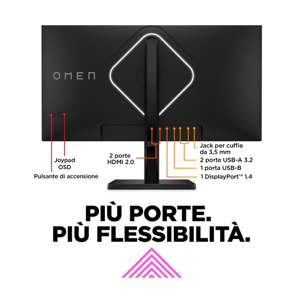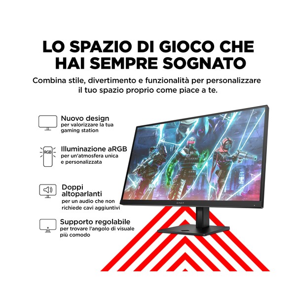Il nuovo look OMEN offre una perfetta combinazione di divertimento e stile per rivoluzionare la tua postazione di gioco con l'illuminazione aRGB, due altoparlanti integrati e un piedistallo regolabile.