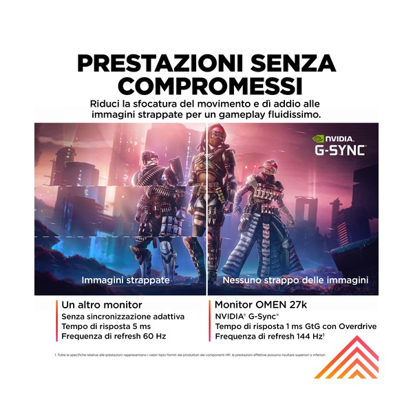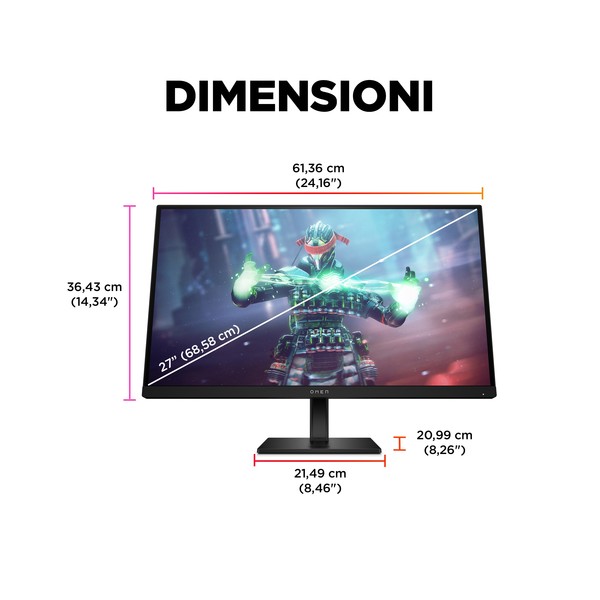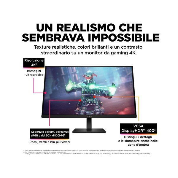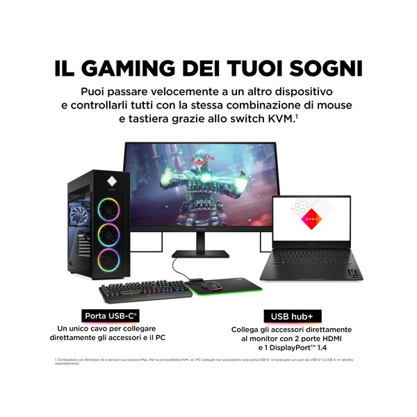 PROTAGONISTA DEL DIVERTIMENTO Con questa centrale del divertimento, potrai giocare, creare e gustare fino in fondo qualunque esperienza, in tutta la magia del 4K[1]. Puoi passare all'istante a un secondo dispositivo, e controllarli entrambi con la stessa combinazione di mouse e tastiera, grazie allo switch KVM integrato[2]. Il monitor da gaming OMEN by HP da 27'' con display UHD a 144 Hz regala straordinarie immagini 4K[1] su PC, console e altri dispositivi.