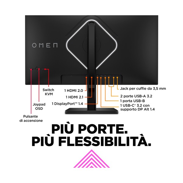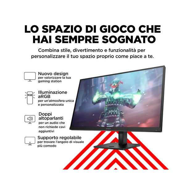 Il nuovo look OMEN offre una perfetta combinazione di divertimento e stile per rivoluzionare la tua postazione di gioco con l'illuminazione aRGB, due altoparlanti integrati e un piedistallo regolabile.