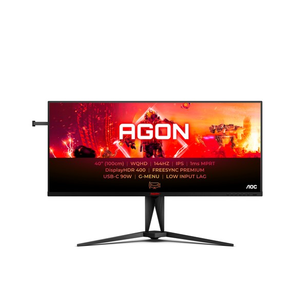 Monitor gaming IPS WQHD da 40" con frequenza di aggiornamento di 144 Hz, super veloce 1 ms MPRT, bassa latenza di input e VESA DisplayHDR 400. Il monitor da gioco AGON AG405UXC è un display da 40 pollici WQHD dotato di pannello IPS, frequenza di aggiornamento di 144 Hz, super-rapido tempo di risposta di 1ms MPRT e basso input lag per garantire che siate sempre al top del vostro gioco. VESA Display HDR400 garantisce un'immersione cromatica ricca per supportarvi durante il gameplay più impegnativo. L'AG405UXC vi terrà comodi e organizzati in cima alle vostre prestazioni, con una porta USB-C che fornisce una Power Delivery di 90W e un supporto regolabile in altezza.