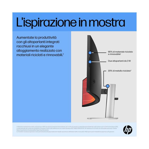 Lavora al meglio con questo monitor dal design elegante, dotato di due altoparlanti integrati da 3W, che dona un tocco di stile ai tuoi spazi. Oltre all'aspetto, lasciati ispirare da questo monitor che contiene materiali riciclati[6]. Personalizza il tuo spazio con una ricca serie di accessori abbinabili[8].