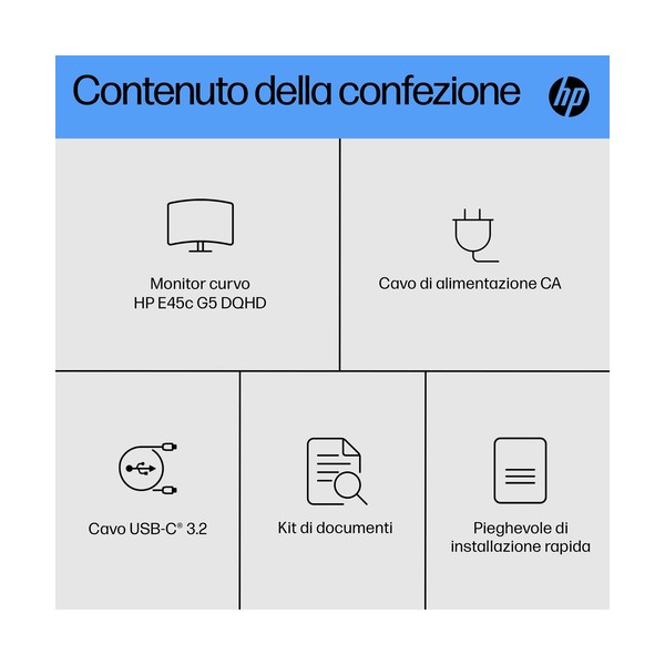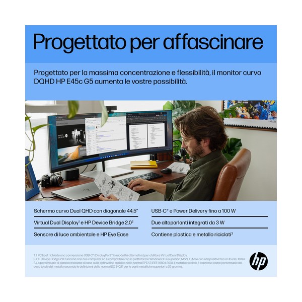 Progettato per affascinare Progettato per la massima concentrazione e flessibilità, il monitor curvo HP E45c G5 DQHD aumenta le tue possibilità. Con uno stile elegante, che pensa al tuo comfort e alla sostenibilità, questo monitor ultrawide è un concentrato di produttività.
