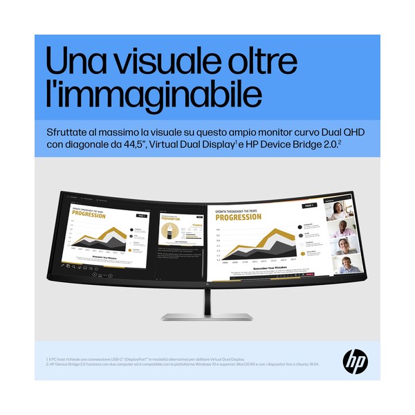 Sostituisci due monitor QHD con questo enorme monitor curvo Dual QHD da 44,5" in diagonale. Con Virtual Dual Display, il monitor può essere diviso in due monitor distinti per condividere una presentazione in uno schermo e interagire con il pubblico nell'altro[1]. In più, puoi visualizzare e utilizzare simultaneamente 2 computer con HP Device Bridge 2.0[2].