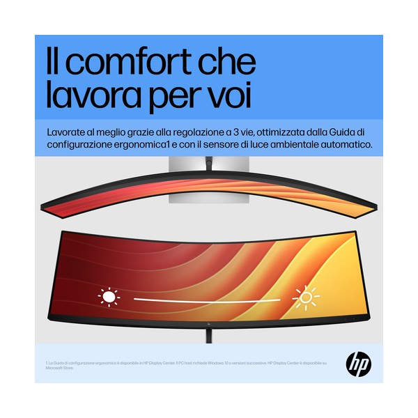 Per dare il meglio bisogna sentirsi al meglio: le 3 modalità regolabili, ottimizzate dalla guida alla configurazione ergonomica[3], assicurano comfort fisico per l'intera giornata, mentre il sensore di luce ambientale, che adatta automaticamente la luminosità del display in base all'ambiente circostante[4], e la tecnologia HP Eye Ease garantiscono il comfort visivo.