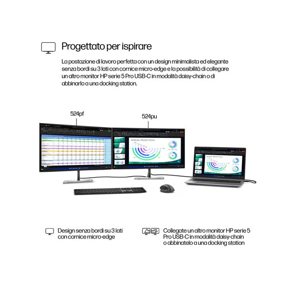 La configurazione di lavoro perfetta, con un elegante design minimal, senza bordi su 3 lati, e la possibilità di abbinare questo monitor a un altro monitor HP serie 5 Pro[4] o collegarlo in modalità daisy-chain.[3]