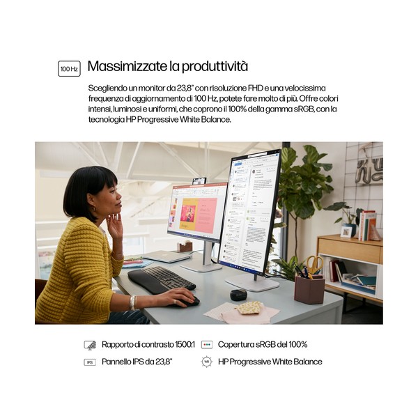 Scegliendo un monitor da 23,8 pollici con risoluzione FHD e frequenza di refresh di 100 Hz, potete fare molto di più[1]. Offre colori intensi, luminosi e uniformi, che coprono il 100% della gamma sRGB[1], e la tecnologia HP Progressive White Balance.[2]