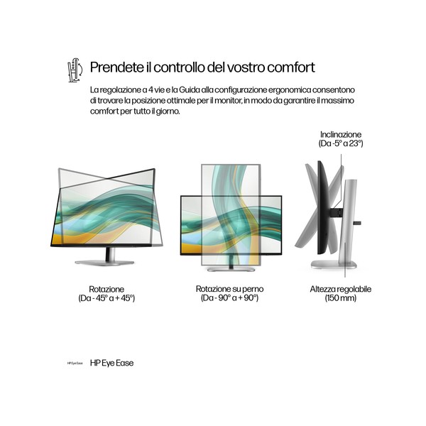 La regolazione a 4 vie e la Guida alla configurazione ergonomica[5] consentono di trovare la posizione ottimale per il monitor, in modo da garantire il massimo comfort per tutto il giorno. HP Eye Ease riduce la luce blu senza alterare il colore.