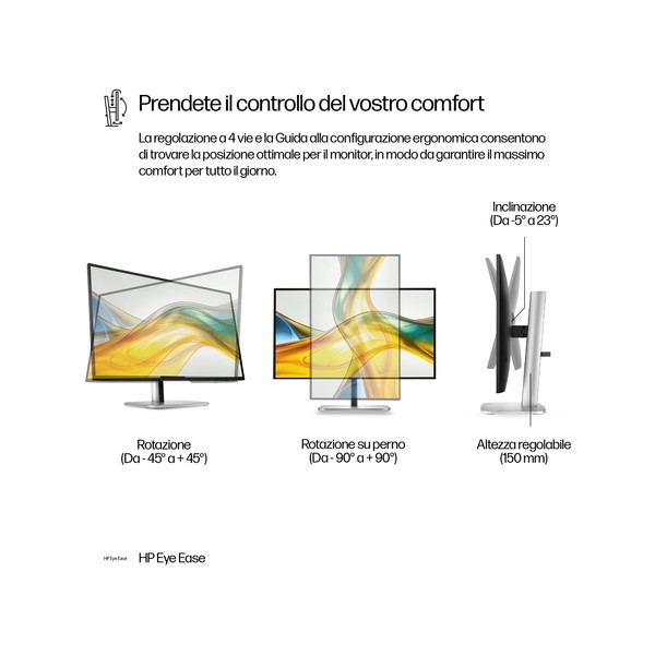 La regolazione a 4 vie e la Guida alla configurazione ergonomica[5] consentono di trovare la posizione ottimale per il monitor, in modo da garantire il massimo comfort per tutto il giorno. HP Eye Ease riduce la luce blu senza alterare il colore.