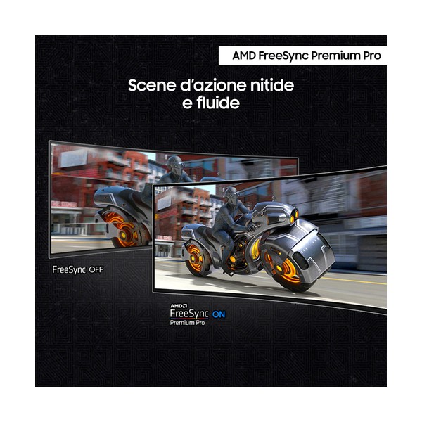 Azione di gioco senza intoppi. Con la compatibilità G-Sync, che permette la sincronizzazione tra la GPU e il pannello, effetto mosso, ritardi e immagini tagliate sono solo un lontano ricordo. In più, AMD FreeSync Premium Pro soddisfa la tua voglia di competizione con scene di gioco stabili e prive di distorsioni, anche quelle più complesse e rapide.