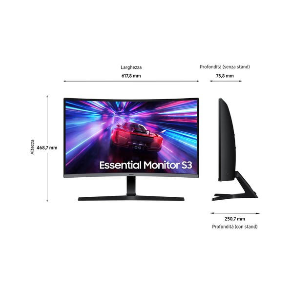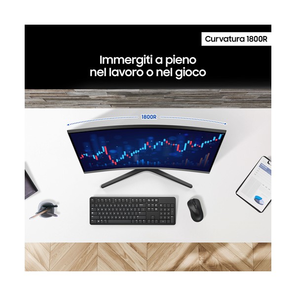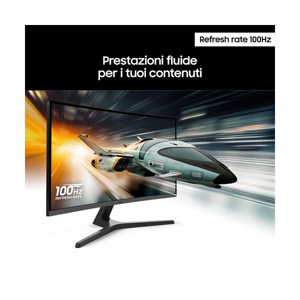 Ancora più coinvolgimento con lo schermo curvo Schermo curvo Un'esperienza visiva incredibilmente immersiva. Il monitor curvo assicura una copertura più ampia del campo visivo, migliorando la percezione della profondità e riducendo al minimo gli elementi di distrazione, per dedicare tutta la tua attenzione alle immagini sullo schermo.