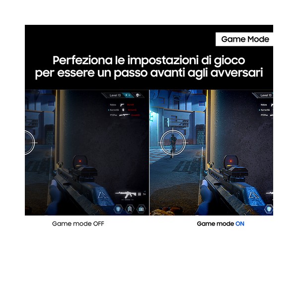Più potere ai gamer Game Mode Assicurati un vantaggio competitivo grazie alle impostazioni di gioco ottimizzabili. Il colore e il contrasto dellimmagine possono essere regolati istantaneamente per vedere più chiaramente le scene e individuare i nemici nascosti nel buio, mentre la Game Mode regola qualsiasi gioco donando allo schermo un'incredibile ricchezza di dettagli.