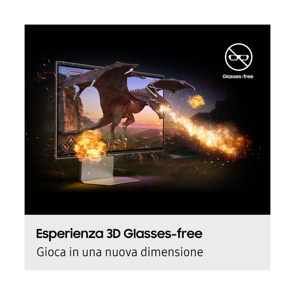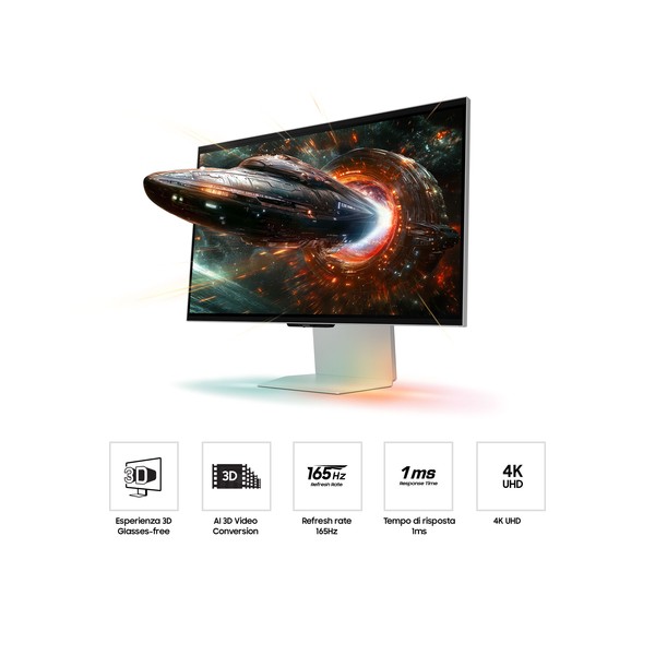 Samsung Monitor Gaming Odyssey 3D da 27'' UHD Flat. Dimensioni diagonale schermo: 68,6 cm (27"), Risoluzione del display: 3840 x 2160 Pixel, Tipologia HD: 4K Ultra HD, Tecnologia display: LCD, Compatibilità 3D, Tempo di risposta: 1 ms, Rapporto d'aspetto nativo: 16:9, Angolo di visualizzazione (orizzontale): 178°, Angolo di visualizzazione (verticale): 178°. Altoparlanti incorporati. Hub USB integrato, Versione dell'hub USB: 3.2 Gen 1 (3.1 Gen 1). Montaggio standard VESA, Regolazione altezza. Colore del prodotto: Argento