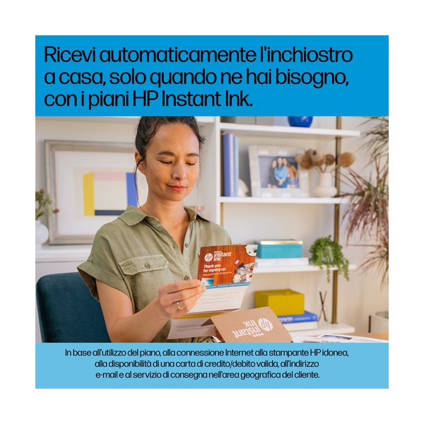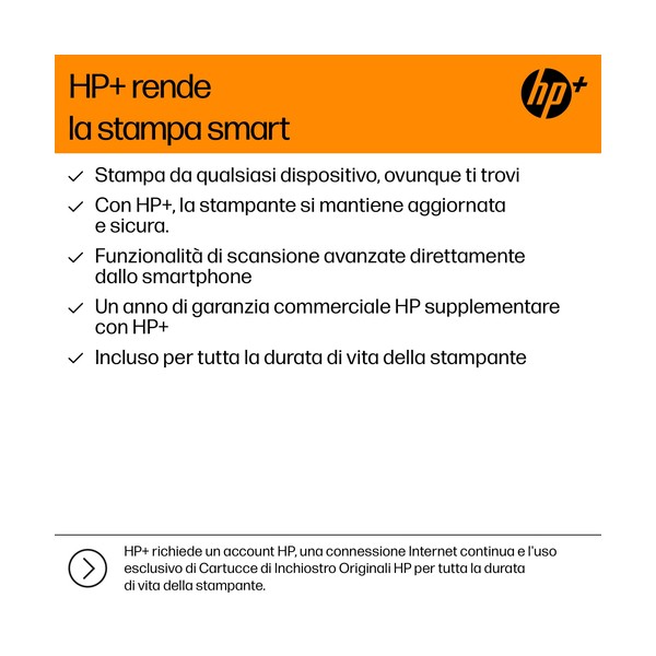 Stampante idonea a HP+. Scegli HP+ durante la procedura di configurazione della tua stampante per attivare tutti i vantaggi. HP+ richiede un account HP, una connessione a Internet continua e l'uso esclusivo delle cartucce di inchiostro Originali HP per tutta la durata di vita della stampante. Per maggiori informazioni consultare: http://www.hp.com/plus