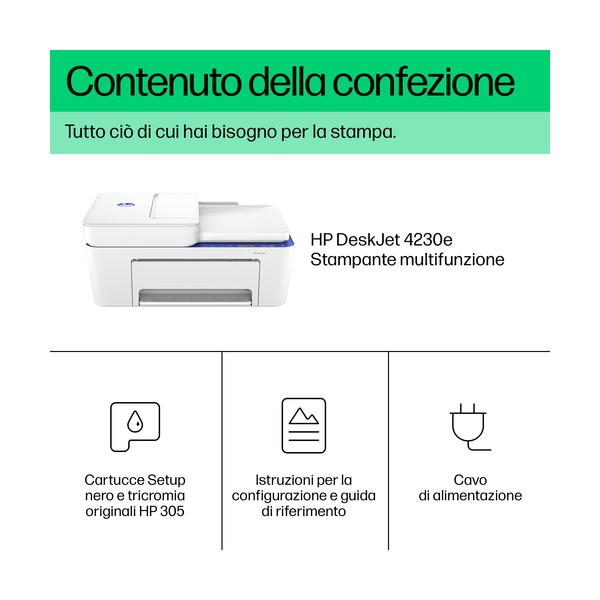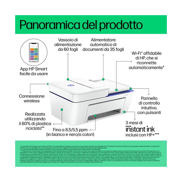 La stampante DeskJet per lavorare con la massima semplicità.[1] Con questa stampante wireless compatta, l'alimentatore automatico di documenti e l'app di stampa migliore della categoria, esegui stampe, copie e scansioni con la massima semplicità. Dalle etichette alle ricette, HP ti offre un'esperienza di stampa semplificata, degna di un leader nel settore stampanti.