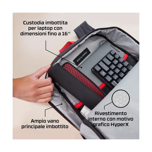 - Oltre ai classici colori HyperX, questo zaino presenta anche cursori per cerniere personalizzati, un esclusivo rivestimento interno e una toppa di HyperX rimovibile. Sfoggia la tua passione per il gaming e per il brand HyperX anche mentre sei in movimento.