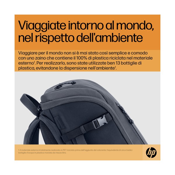 Viaggiare per il mondo non è mai stato così comodo, con uno zaino leggero che contiene il 100% di plastica riciclata nei materiali esterni[2]. Rilassatevi, pensando che ci sono 13 bottiglie di plastica in meno a inquinare l'ambiente[2].