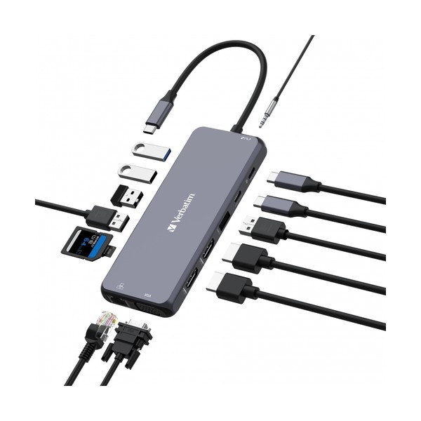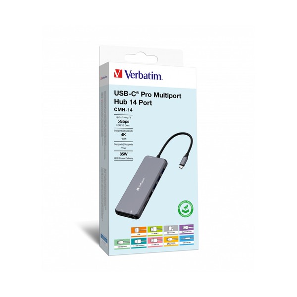 Connettività diversificataL'hub multiporta USB-C® Pro 14 porte di Verbatim è caratterizzato da un'ampia scelta di connessioni. Grazie alle quattordici porte, tra cui due porte HDMI più una porta VGA per il supporto di monitor legacy, è possibile lavorare e visualizzare in multi-schermo. Le numerose porte USB, tra cui cinque USB-A e due USB-C, tra cui una USB-C PD, forniscono la possibilità di utilizzare dispositivi multipli con il vantaggio di una connessione Internet cablata attraverso la porta gigabit ethernet. Per i fotografi alle prime armi, l'hub prevede sia uno slot per scheda di memoria SD che microSD che consente il trasferimento di foto e video in maniera semplice e veloce. Infine, la porta audio da 3,5 mm consente di utilizzare gli altoparlanti o le cuffie in tutta semplicità e comodità.