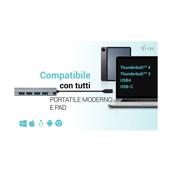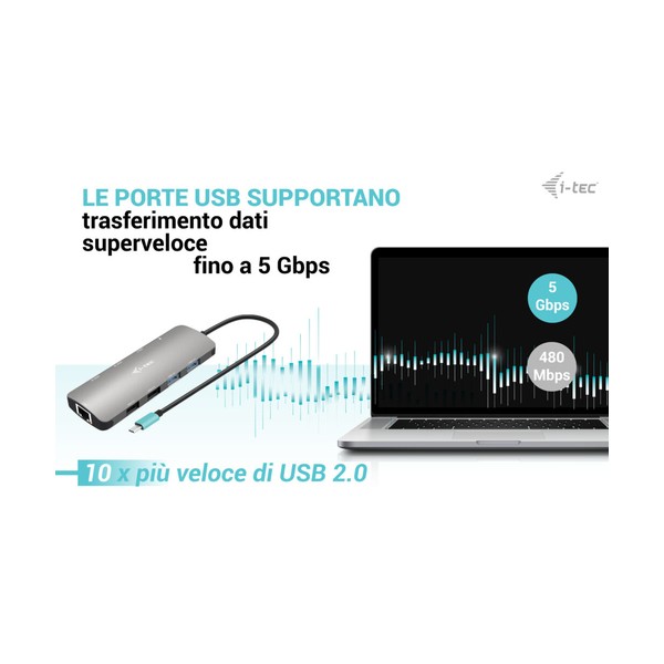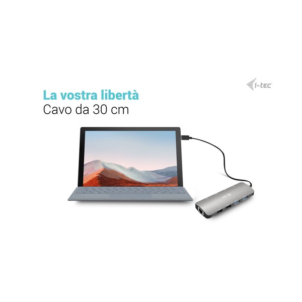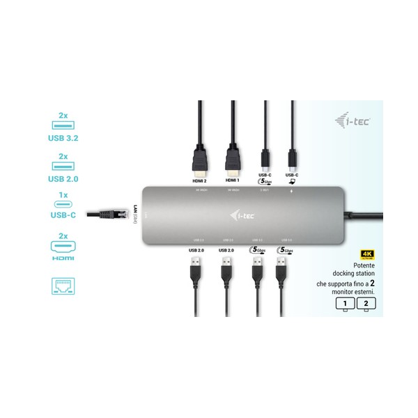 Piccola docking station USB-C in metallo in grado di supportare fino a due monitor esterni contemporaneamente*. È sufficiente collegare il laptop o il tablet (non è necessario installare i driver) per beneficiare di un rapido trasferimento di dati USB e della connessione a Internet tramite una porta LAN. Naturalmente, la docking station è in grado di alimentare il laptop fino a 100 W, consentendo di ricaricare tutti i laptop e i tablet che supportano la ricarica tramite USB-C (USB-C Power Delivery). Il corpo in alluminio spazzolato garantisce alla docking station una durata e una resistenza sufficienti anche in caso di viaggi frequenti. Il cavo USB-C integrato è sufficientemente lungo per garantire una connessione confortevole anche se la porta USB-C si trova nella parte superiore della cornice dello schermo (tipica dei laptop/tablet ibridi). La docking station è inoltre pienamente compatibile con i tablet e i laptop dotati di una porta Thunderbolt 3/4. - È possibile collegare fino a due monitor esterni. - Potenza erogata: fino a 100 W (il caricabatterie USB-C non è incluso nella confezione). - Dotato di due porte HDMI - 2 porte USB 3.2 (5 Gbps), 2 porte USB 2.0 e 1 porta USB-C consentono di collegare facilmente dispositivi e periferiche USB. - Gigabit Ethernet RJ-45 fornisce una connessione Internet affidabile, robusta e ad alta velocità, supportando velocità di 10/100/1000 Mbps. - Supporta Windows 10/11, macOS, Android, Chrome OS e Linux * macOS non supporta la tecnologia Multi Stream Transport (MST), il che significa che quando è collegato a un dispositivo che esegue macOS, entrambi i monitor esterni collegati visualizzeranno la stessa immagine.
