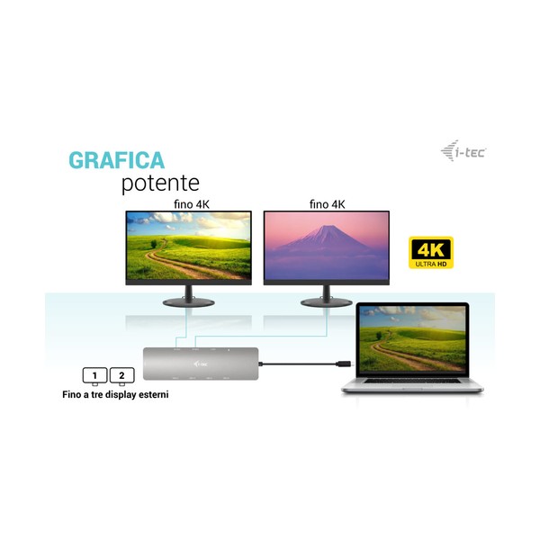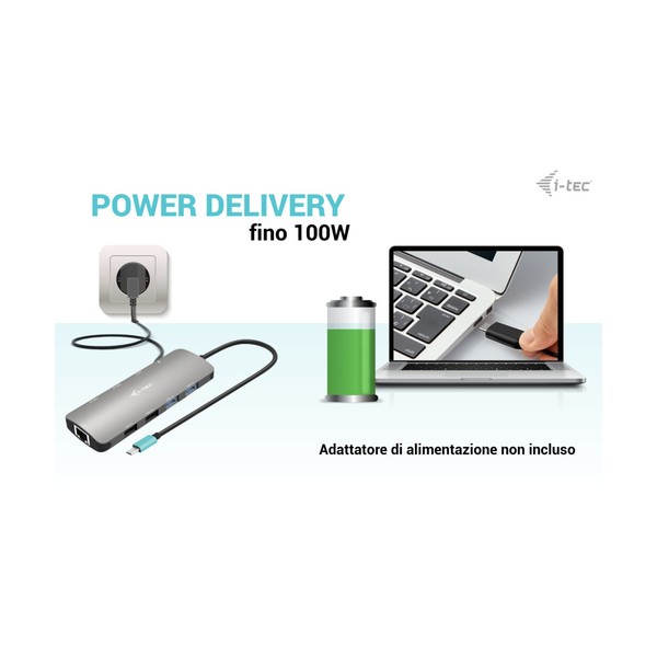 La docking station supporta fino a 100W di potenza per un laptop o tablet collegato (caricatore USB-C non incluso)