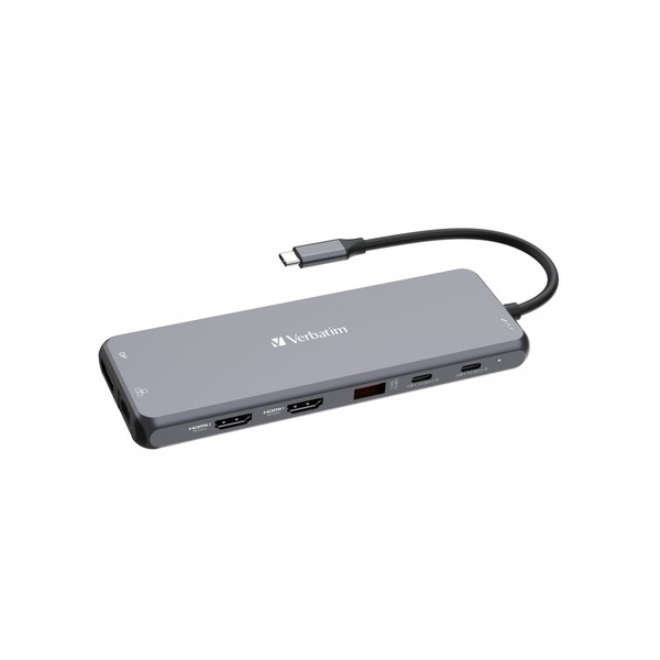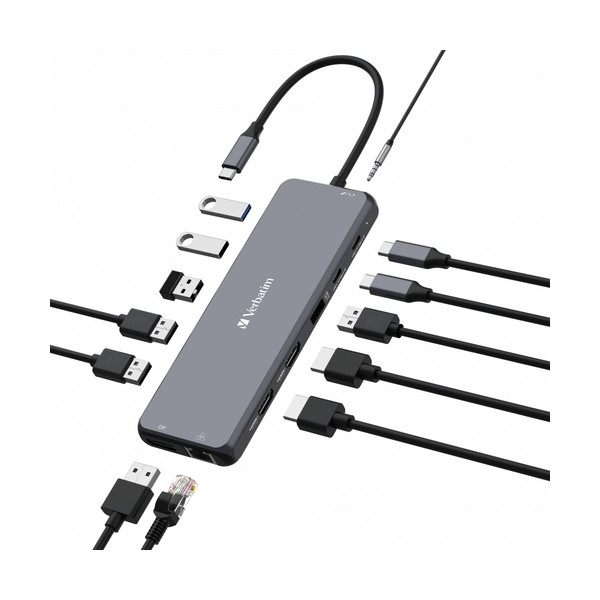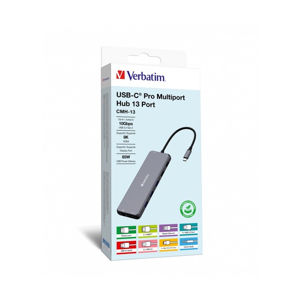 Espansione ampliata: Tredici porte a disposizione per le opzioni di connessione più innovativeL'hub multiporta USB-C® Pro 13 porte di Verbatim è caratterizzato da un'ampia gamma di opzioni di connettività, tra cui due porte HDMI e una DisplayPort per operare su tre schermi. Ideale per editor e creativi, la porta gigabit ethernet fornisce la capacità di beneficiare della velocità di una connessione Internet cablata, mentre la porta audio permette il collegamento di altoparlanti o cuffie. Sono disponibili ben sei porte USB-A di generazioni differenti che supportano dispositivi di velocità diverse e due porte USB-C PD (Power Delivery) per assicurare che i tuoi dispositivi restino sempre carichi.
