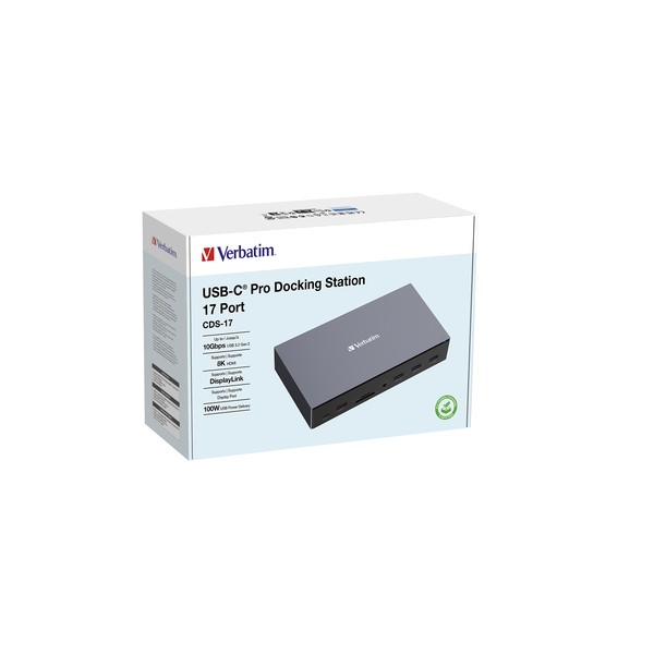 Verbatim CDS-17. Tecnologia di connessione: Cablato, Interfaccia host: USB 3.2 Gen 1 (3.1 Gen 1) Type-C, Fornitura di alimentazione USB fino a: 100 W. Velocità trasferimento Ethernet LAN: 1000 Mbit/s. Colore del prodotto: Nero, Grigio, Tipi schede di memoria: MicroSD (TransFlash), SD, Velocità di trasferimento dati: 10 Gbit/s. Tipologia alimentazione: dC, Alimentazione: 120 W, Voltaggio di uscita: 20 V. Sistema operativo Windows supportato: Windows 10, Windows 11, Compatibilità sistema operativo Mac: Mac OS X 10.2 Jaguar, Mac OS X 10.3 Panther, Mac OS X 10.4 Tiger, Mac OS X 10.5 Leopard, Mac OS X...