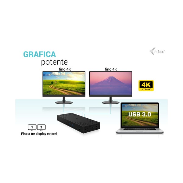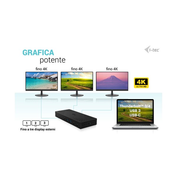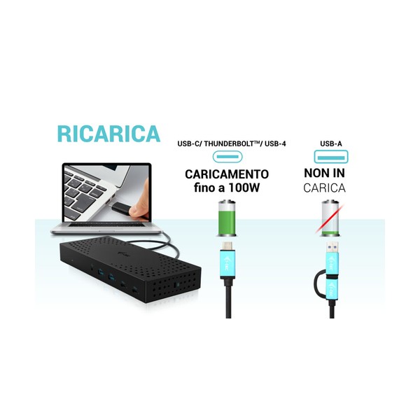 La docking station supporta fino a 100W di potenza per un notebook o un tablet collegato (quando è collegata a una porta USB-C o ThunderboltTM corrispondente Quando è collegata a una porta USB 3.0, il laptop non può essere caricato)