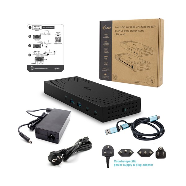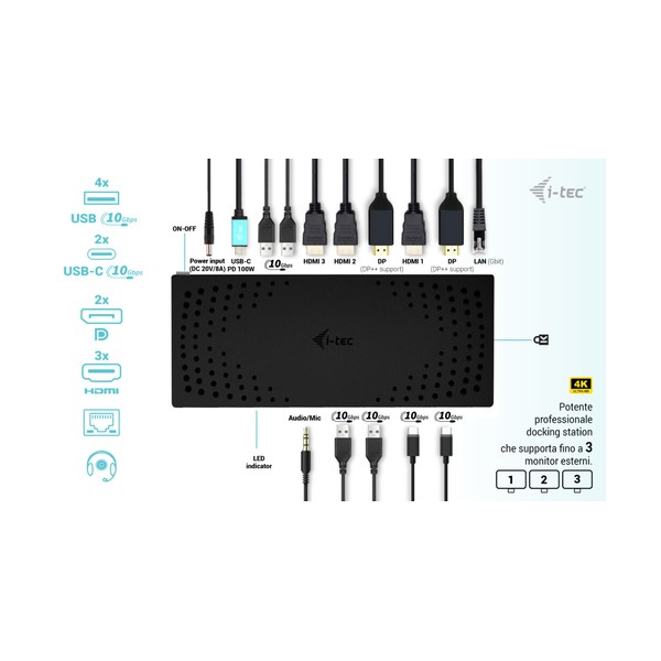 Una potente docking station professionale Gen 2 che supporta l’output fino a tre monitor esterni in alta risoluzione 4K. Il dock può essere utilizzato praticamente con tutti i notebook in quanto supporta la connessione a tutte le porte più comuni: USB 3.0, USB-C e Thunderbolt” 3/4, e supporta tutti i più comuni sistemi operativi attuali. Tuttavia, il collegamento a tre monitor sarà possibile solo se il notebook dispone di una porta Thunderbolt” 3/4 o di una porta USB-C che supporta il trasferimento video (modalità USB-C DP Alt). Se collegato a un notebook con porta USB 3.0, saranno supportati solo due monitor. L’abbondanza di porte USB (tutte supportano velocità Gen 2 fino a 10 Gbps), la connessione affidabile e veloce alla rete aziendale grazie alla porta LAN integrata e il supporto per l’installazione dietro il monitor fanno di questa docking station il compagno ideale per i veri professionisti. Naturalmente, supporta la ricarica del laptop o del tablet, fino a 100 W. - Possibilità di collegare 3 monitor esterni con risoluzioni fino a 4K*. - Power delivery: fino a 100 W - 2 porte DisplayPort e 3 HDMI disponibili* - 4 porte USB 3.2 Gen 2 (10 Gbps) e 2 porte USB-C Gen 2 (10 Gbps) consentono di collegare facilmente dispositivi e periferiche USB. - Gigabit Ethernet RJ-45 fornisce una connettività Internet affidabile, robusta e ad alta velocità con supporto per velocità di 10/100/1000 Mbps - Jack combinato per audio e microfono - Il lucchetto Kensington fornisce una protezione antifurto, soprattutto negli uffici condivisi o nelle aree pubbliche. - L’interruttore di alimentazione della docking station consente il massimo risparmio energetico - La docking station supporta un supporto VESA per un’installazione verticale intelligente dietro un monitor abilitato VESA - Supporta Windows 10 / 11, macOS, Android 5 o successivo, Chrome OS R51 o successivo, Linux Ubuntu *La porta HDMI 3 funziona solo se collegata a un computer portatile con porta Thunderbolt 3/4 o porta USB-C che supporta il trasferimento video (modalità USB-C DP Alt). Se la docking station è collegata tramite porta USB 3.0, la ricarica non è supportata.